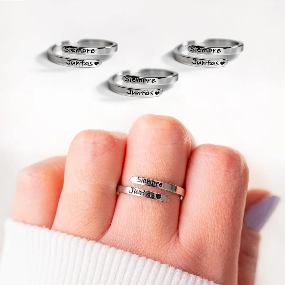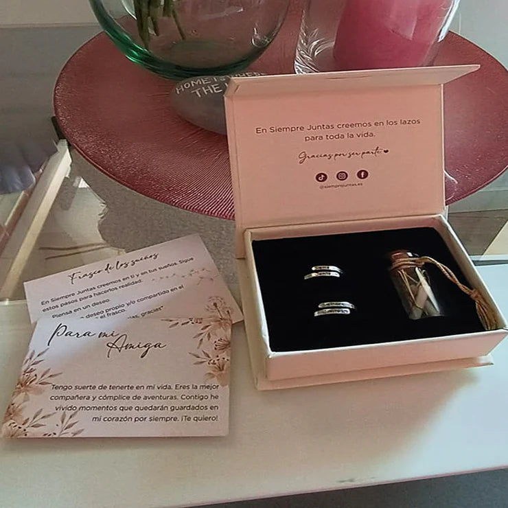 Incluye 2 de nuestros anillos grabados “Siempre Juntas ♥”, que representa ese vínculo que las une para siempre, y 2 pulseras Nudo Infinito, diseñadas para representar un lazo que nunca las separará.