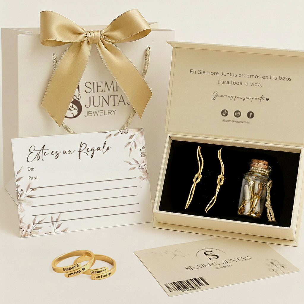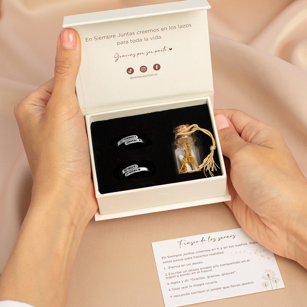 Incluye 2 de nuestros anillos grabados “Siempre Juntas ♥”, que representa ese vínculo que las une para siempre, y 2 pulseras Nudo Infinito, diseñadas para representar un lazo que nunca las separará.