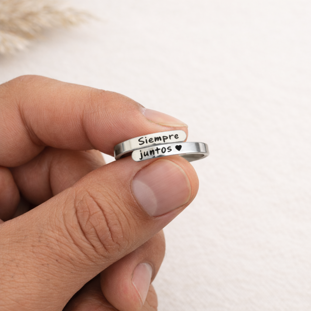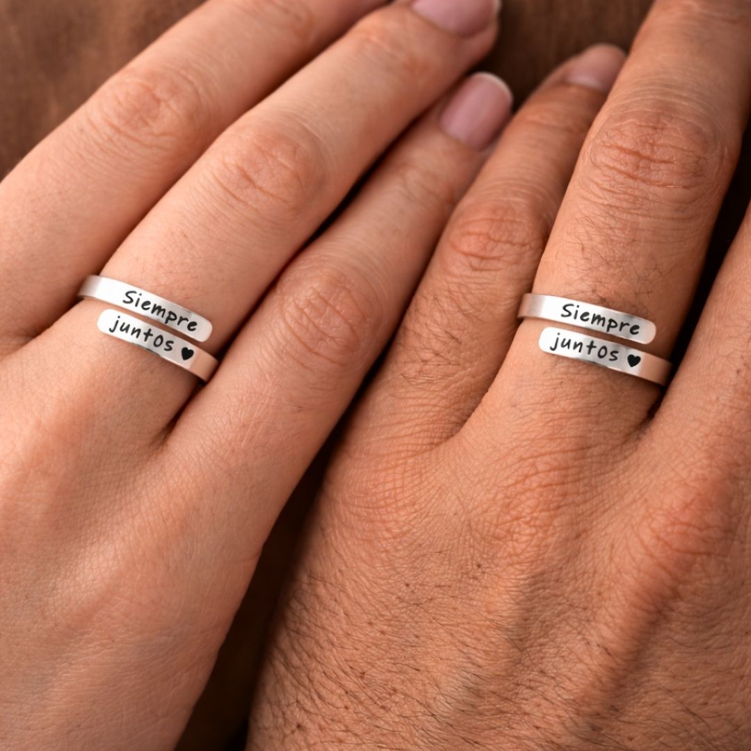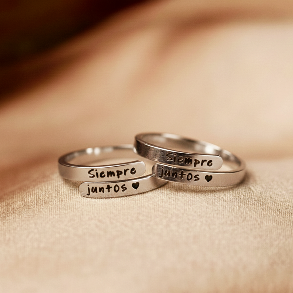Este anillo grabado con la frase "Siempre Juntos" no es solo un accesorio; es un recordatorio constante de lealtad y apoyo. Diseñado para ser elegante y discreto, es el símbolo perfecto de una unión que no conoce límites.