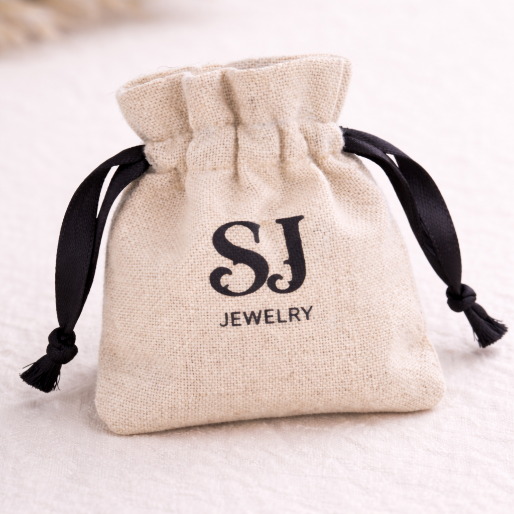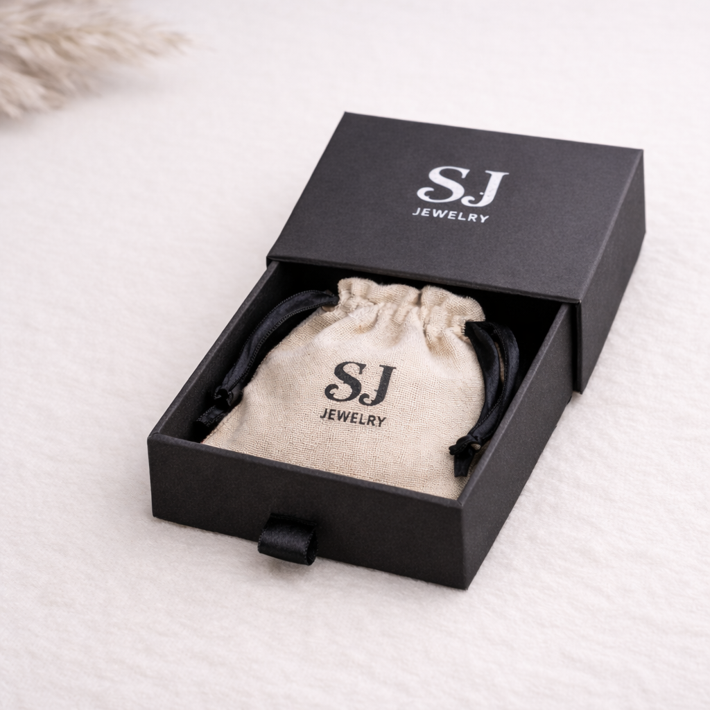 Las joyas vienen protegidas en una elegante caja negra y guardadas dentro de una bolsa de lino natural con cinta de satén. Una experiencia hermosa para regalar y de alta calidad.