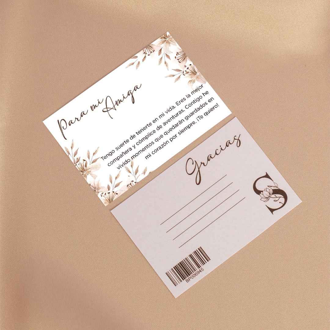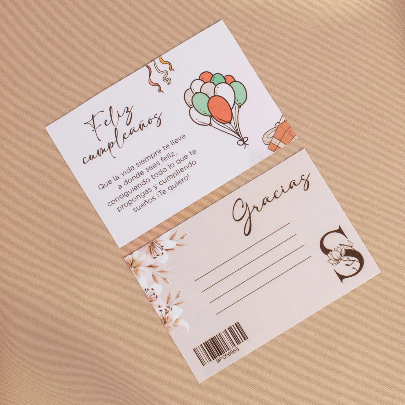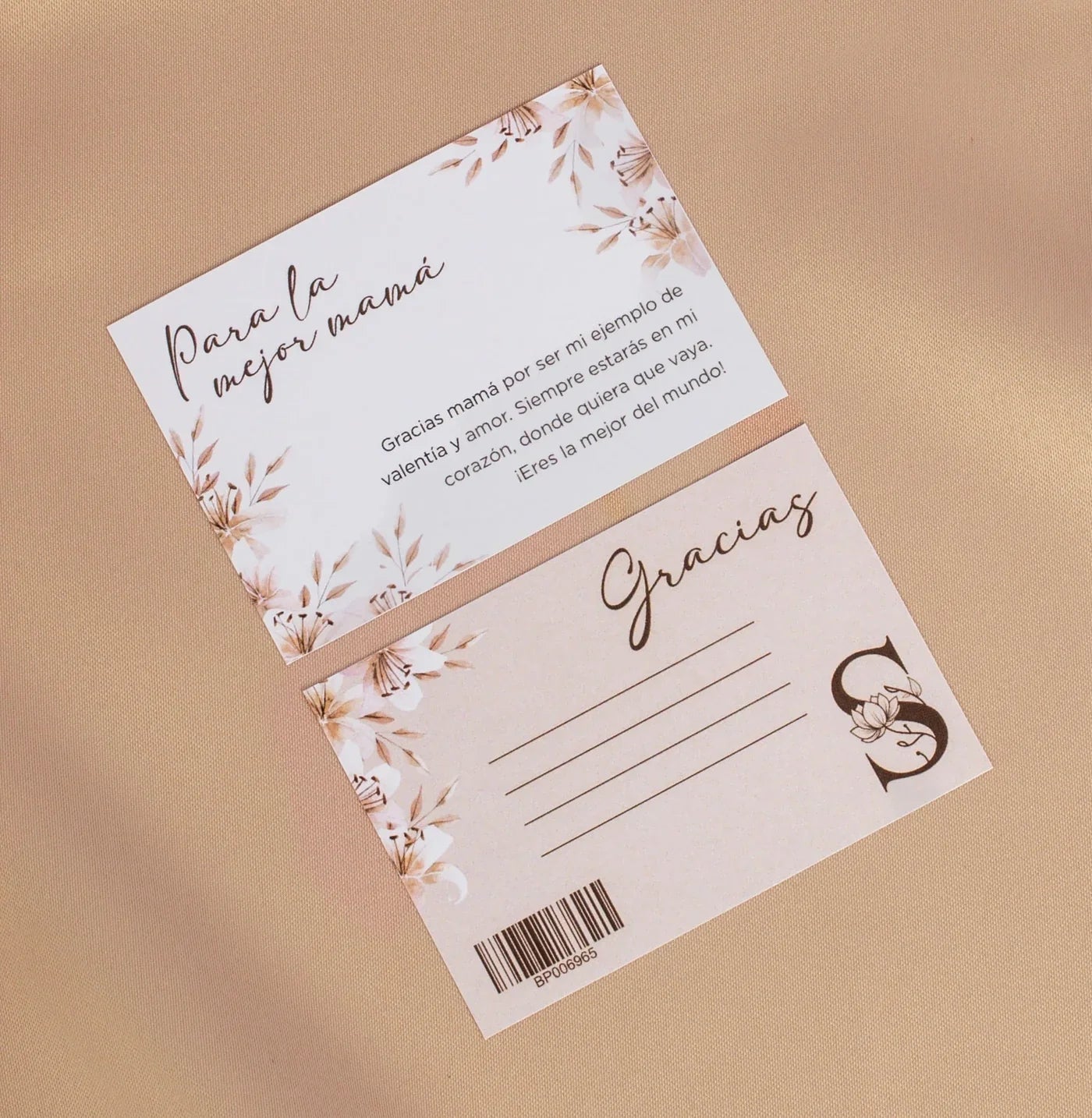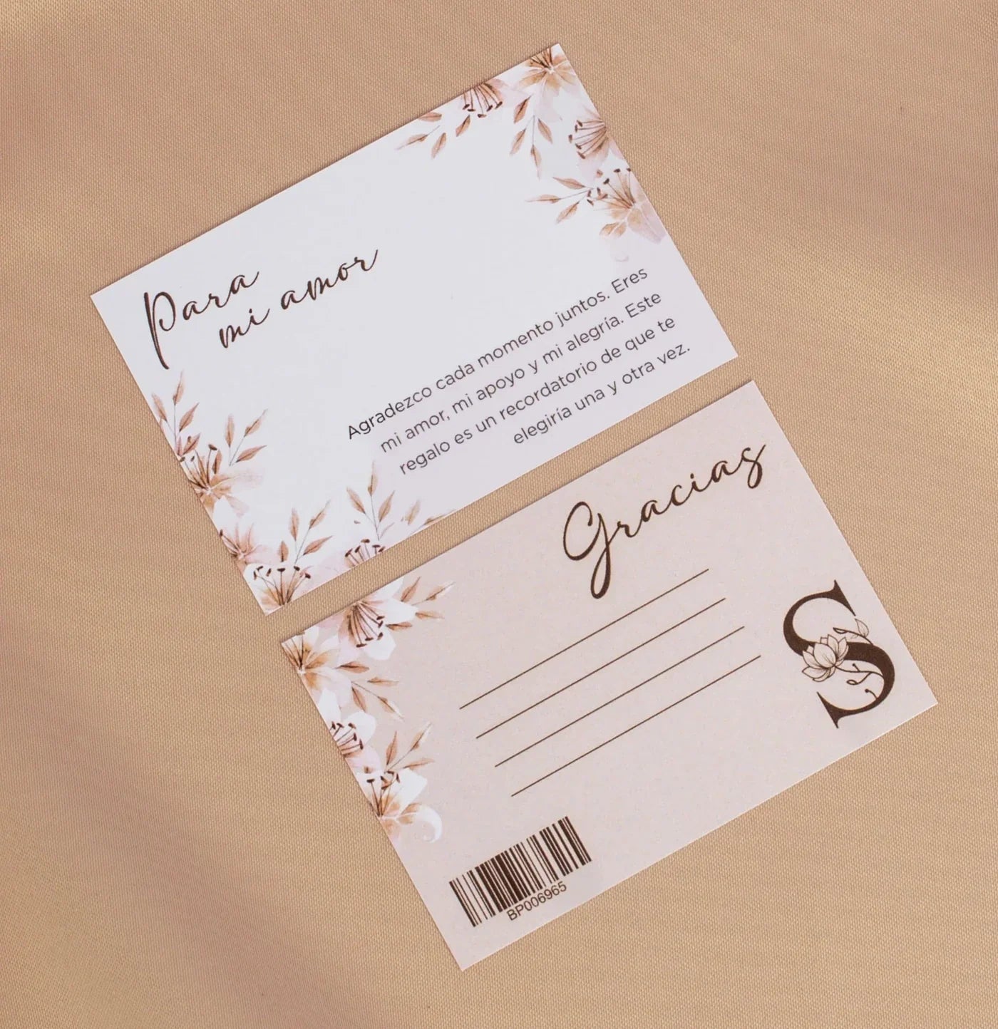 Con un diseño elegante y minimalista, cada tarjeta mide 8,5 cm x 5,5 cm y está impresa en papel de alta calidad. Disponibles para diferentes ocasiones, permiten expresar amor, gratitud y cariño con las palabras justas.