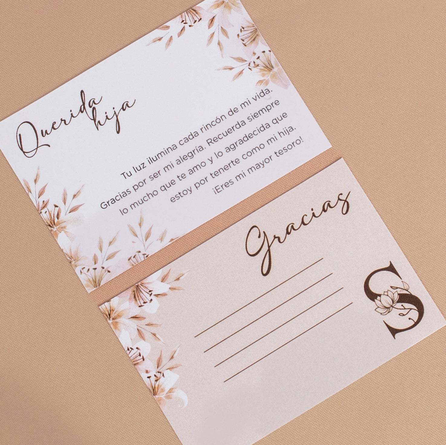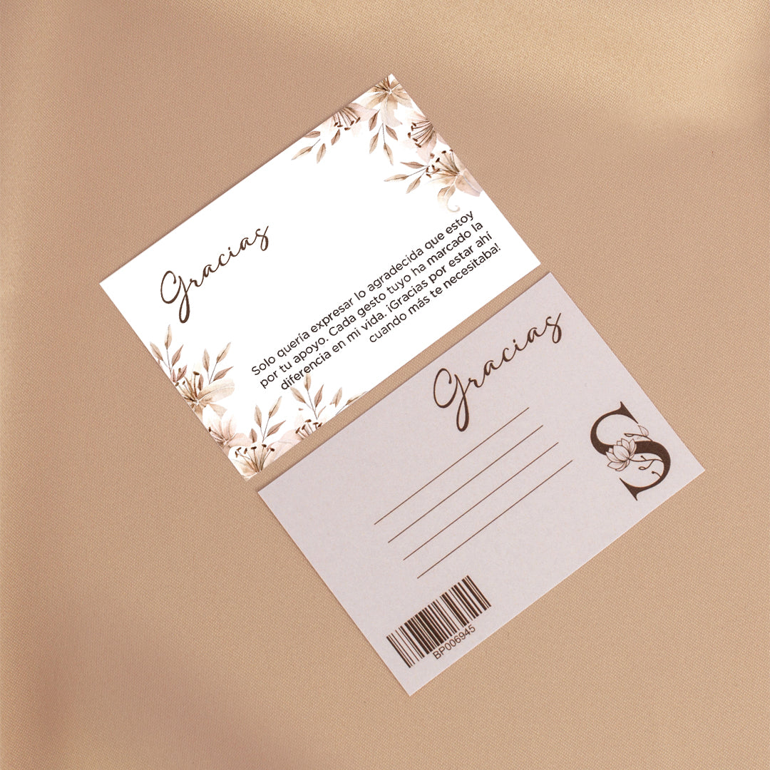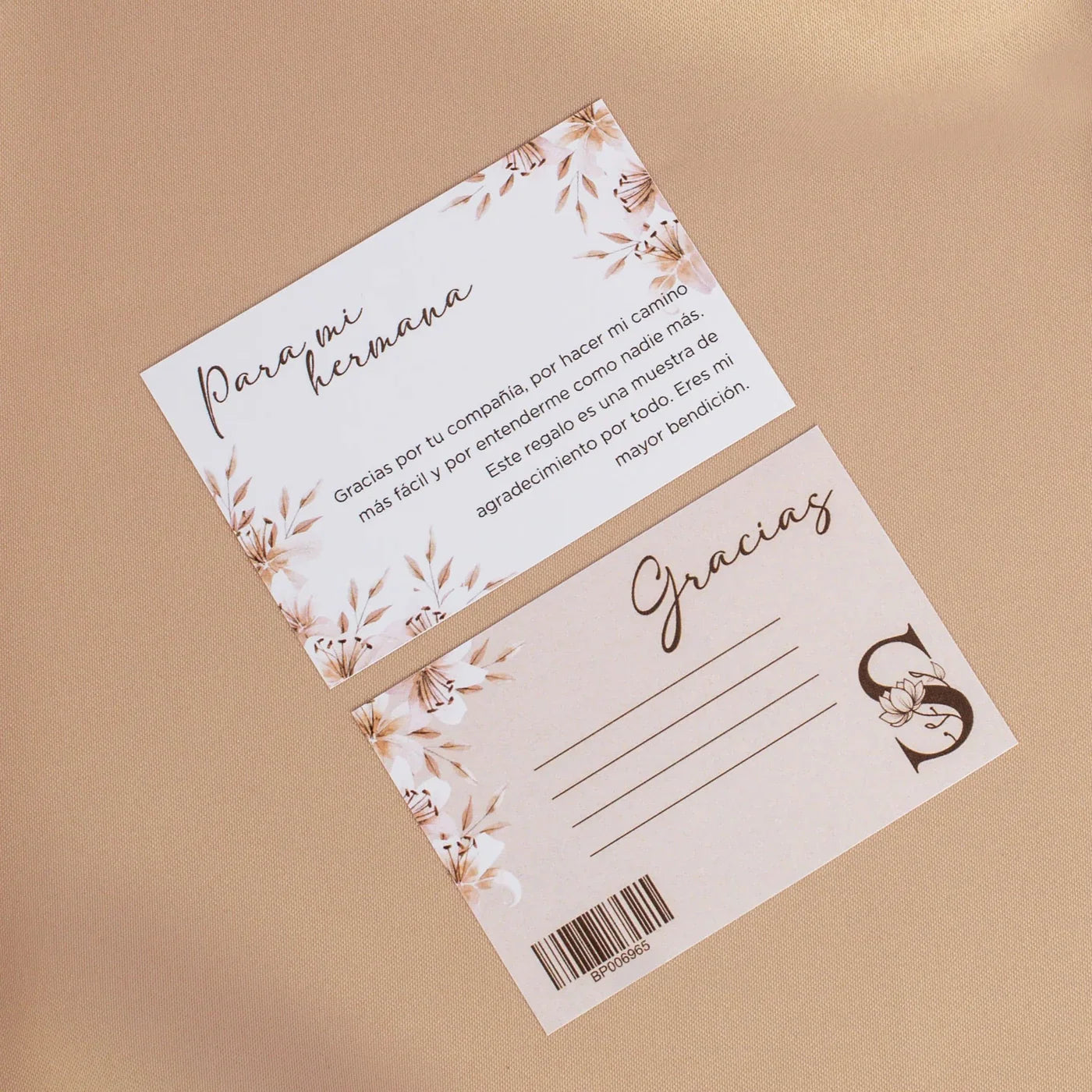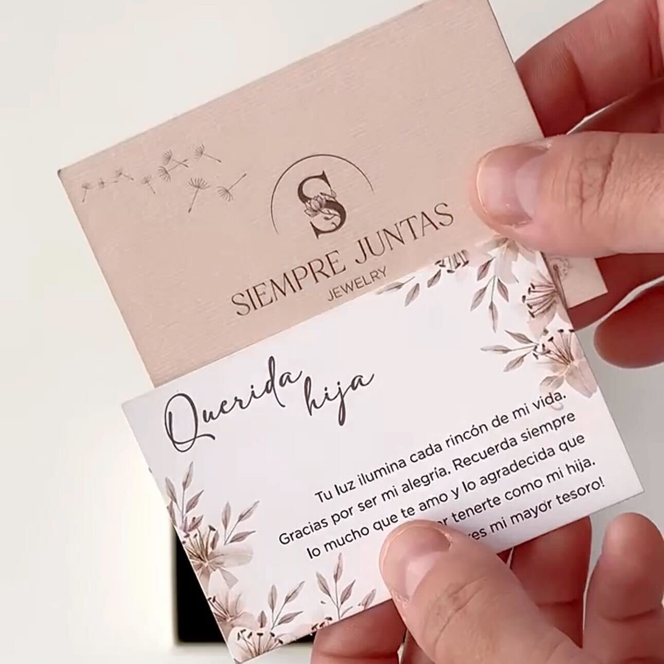 Con un diseño elegante y minimalista, cada tarjeta mide 8,5 cm x 5,5 cm y está impresa en papel de alta calidad. Disponibles para diferentes ocasiones, permiten expresar amor, gratitud y cariño con las palabras justas.